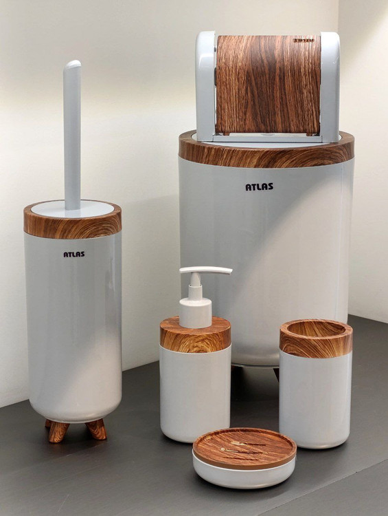 ست شامل: سطل با درب بادبزنی / فرچه توالت / جامایع / جامسواکی / جاصابونی / جادستمالی