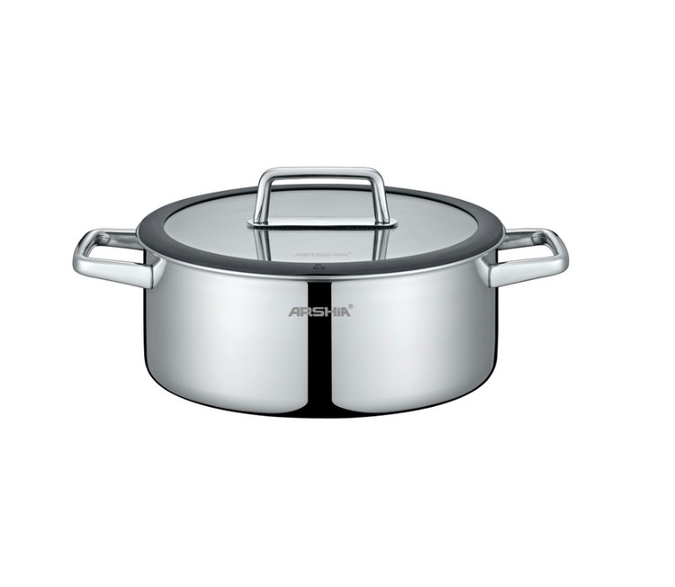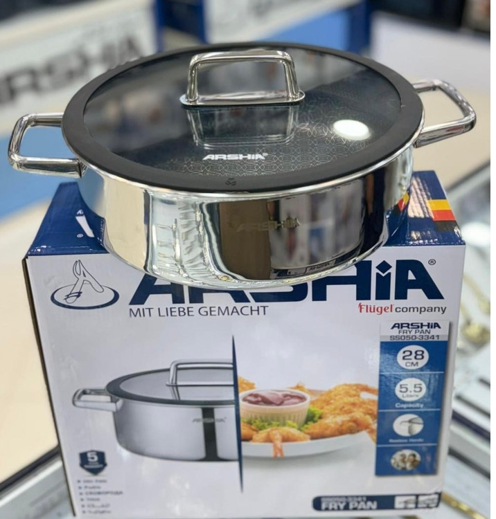ماهیتابه دو دسته استیل کف لیزری 28 سانتی عرشیا مدل SS050-3341 با طراحی سهلایه و ظرفیت 5.3 لیتر، انتخابی عالی برای هر آشپزخانه است.