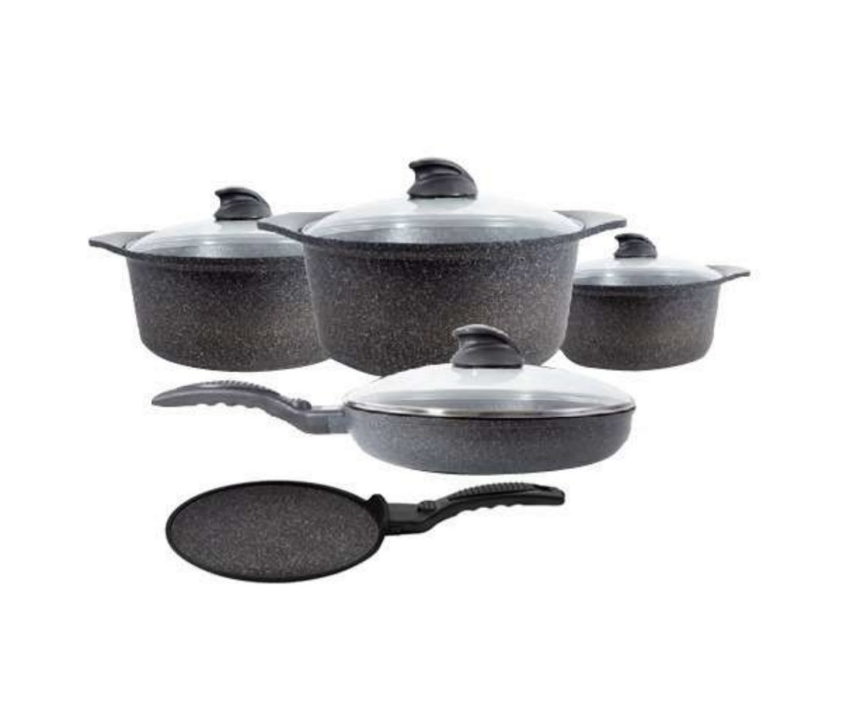 پوشش گرانیت با ذرات معدنی برای رهاسازی بی دردسر غذا تولید شده از تکنولوژی پیشرفته 6 لایه پوشش تقویت شده با ذرات معدنی هدایت حرارتی عالی دسته باکلیت بادوام و مقاوم در برابر حرارت آلومینیوم ریخته گری با کیفیت برتر طراحی بدنه کم مصرف و نوآورانه برای حفظ و توزیع عالی گرما با دستگیره کنترل بخار منحصر به فرد قابل شستشو در ماشین ظرفشویی ترکیب:قابلمه 28 سانتی متر، قابلمه 24 سانتی متر،قابلمه 20 سانتی متر، ماهی تابه 28 سانتی متر، تابه ساج24 سانتی متر