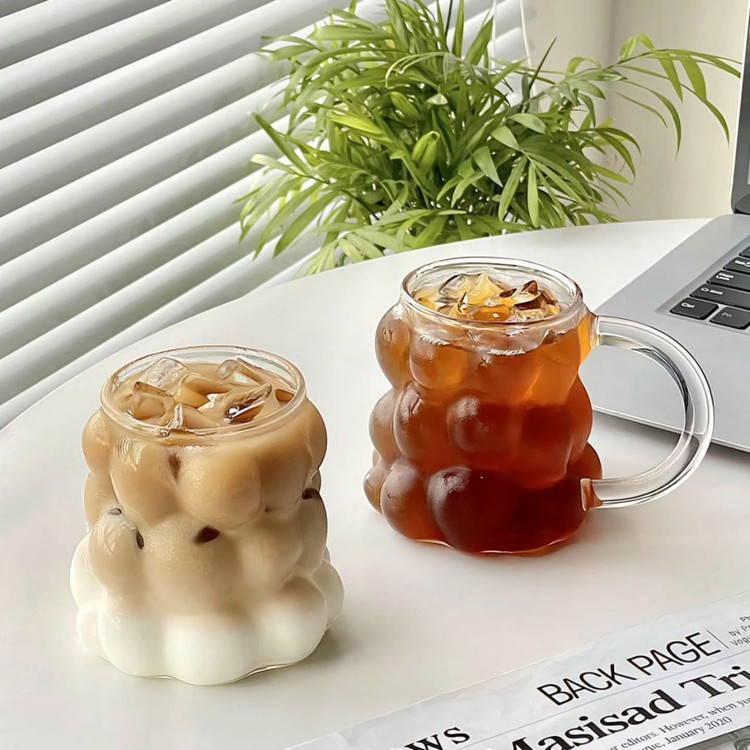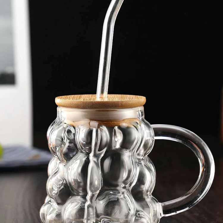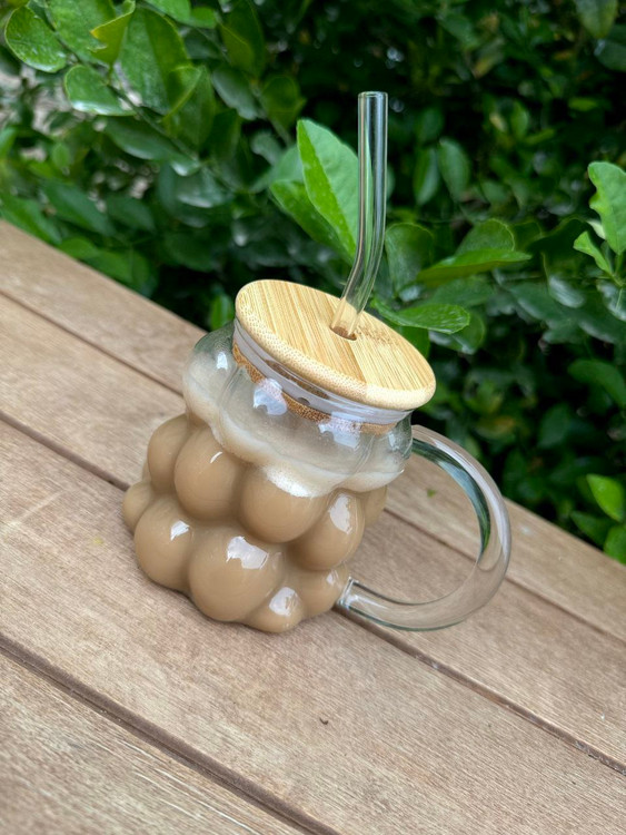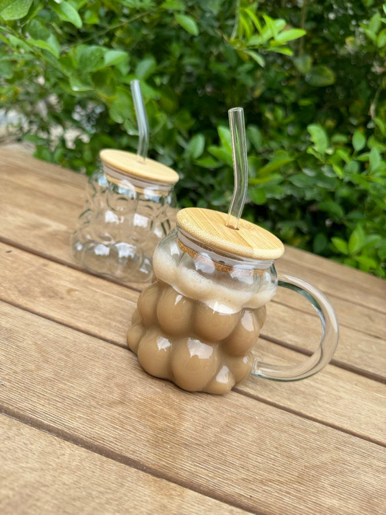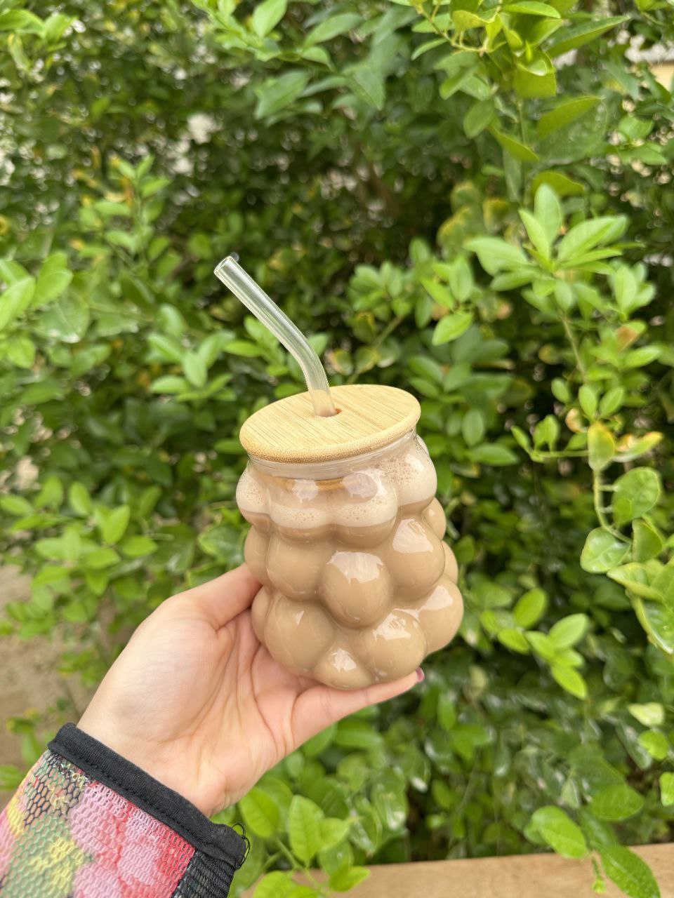 لیوان اسموتی حبابی bubble 🫧همراه با درب بامبو و نی پیرکس