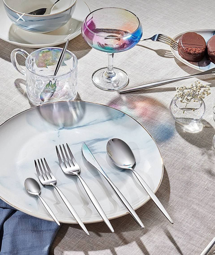 ست شامل : ۱۲ عدد قاشق غذا (20.5 cm) / ۱۲ عدد چنگال غذا (21 cm) / ۱۲ عدد چاقو غذا (23 cm) / ۱۲ عدد چنگال دسر (18 cm) / ۱۲ عدد قاشق چای‌خوری (12 cm)