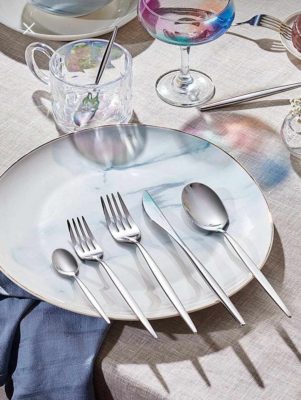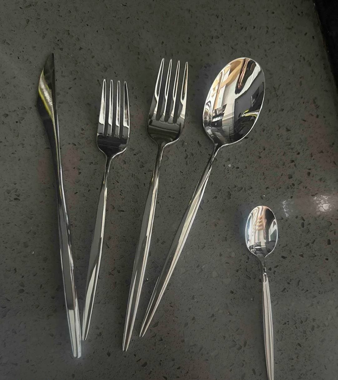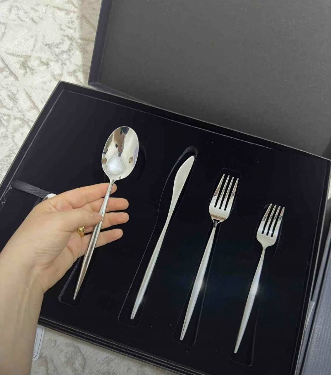 ست شامل : ۱۲ عدد قاشق غذا (20.5 cm) / ۱۲ عدد چنگال غذا (21 cm) / ۱۲ عدد چاقو غذا (23 cm) / ۱۲ عدد چنگال دسر (18 cm) / ۱۲ عدد قاشق چای‌خوری (12 cm)