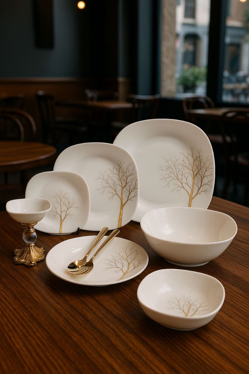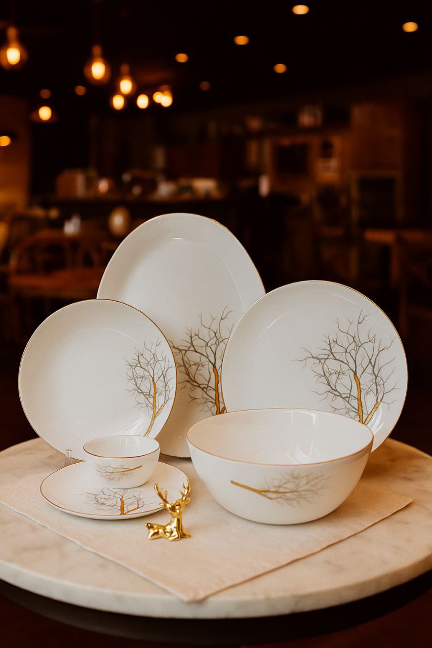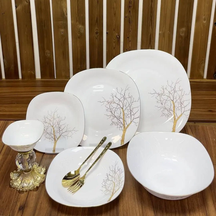 سرویس اپال ۲۶ پارچه ساده و لب طلایی طرح درختی