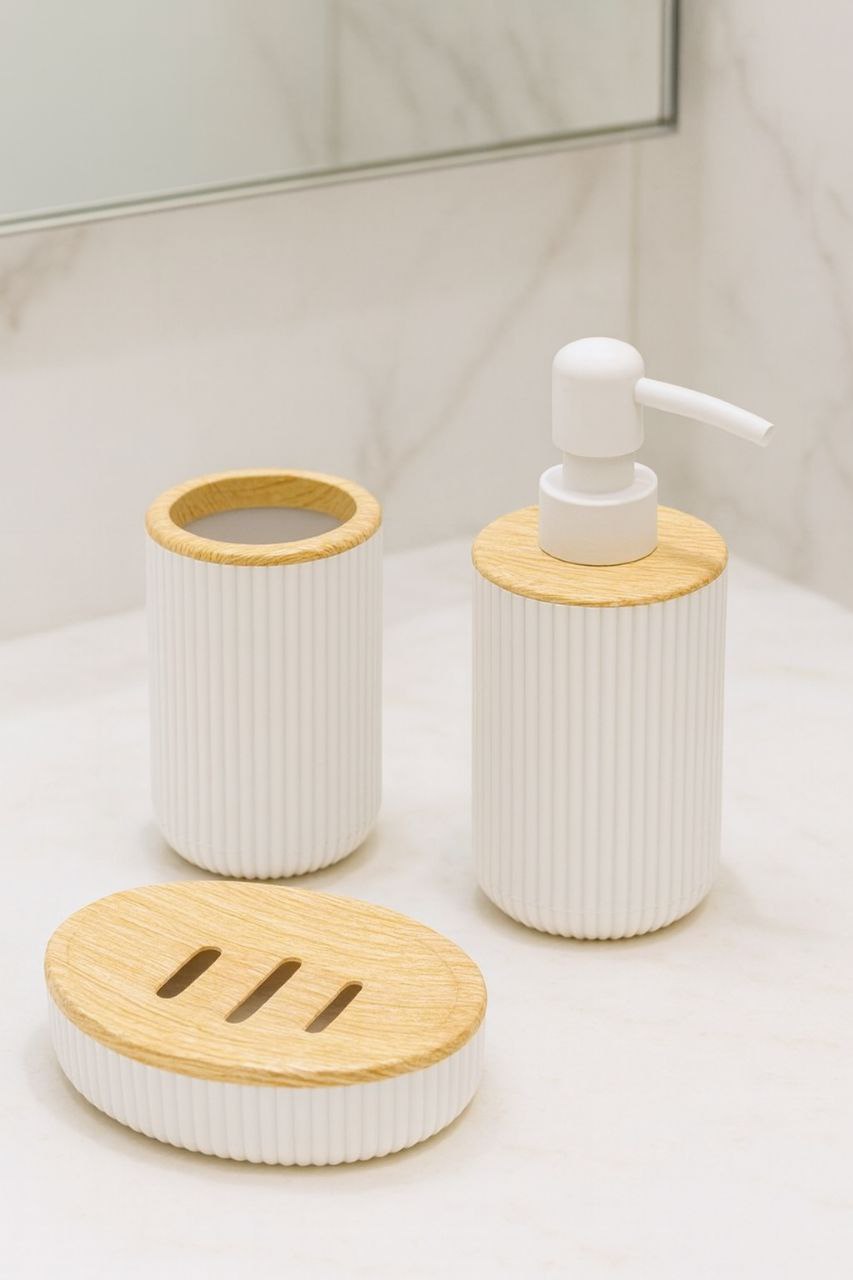 ست شامل : سطل زباله / جامایع / جاصابون / جامسواک / فرچه سرویس
